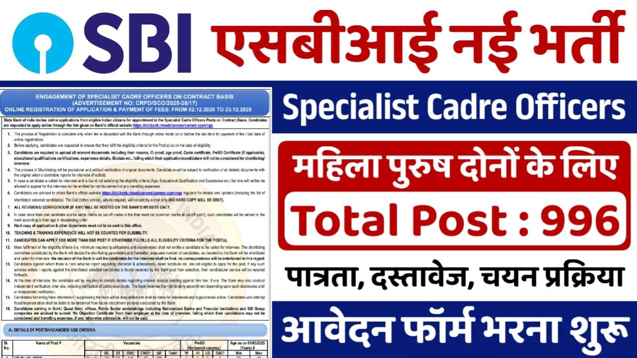 SBI Bank SO Recruitment 2026: भारतीय स्टेट बैंक 996 पद पर भर्ती जारी